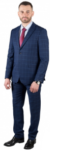 Приталенный мужской костюм двойка сшит из гладкой ткани в крупную клетку. Цвет синий. Брюки зауженного кроя. Ширина низков брюк на размер 52/182 - 19 см.