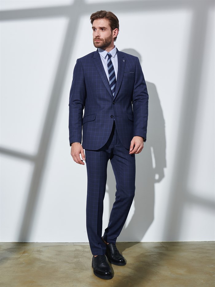 Мужской костюм тёмно-синего цвета, приталенный. Брюки зауженные, ширина низков на 52р- 18см.