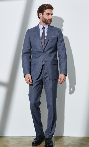 Прилегающий мужской костюм двойка сшит из гладкой ткани. Цвет серый. Брюки прямого кроя. Ширина низков брюк на размер 52/182 - 20,5 см.