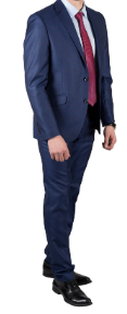 Приталенный мужской костюм двойка сшит из гладкой ткани в клетку. Цвет синий. Брюки зауженного кроя. Ширина низков брюк на размер 52/182 - 19 см.