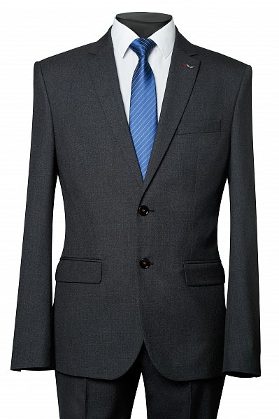 Приталенный мужской костюм двойка сшит из гладкой ткани. Цвет графитовый. Брюки зауженного кроя. Ширина низков брюк на размер 52/182 - 20 см.